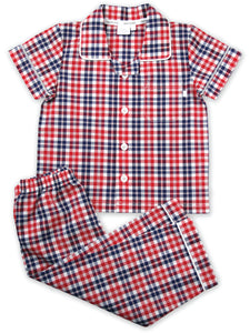 Red and Navy nautical style check in a super-soft crisp check create Spring/Summer vibes in our boys’ pyjama set. Made from 100% cotton, the set is trimmed with white cotton. The short-sleeve top has an open collar, a single chest pocket and fastens at the front with engraved buttons. Trousers are fully elasticated at the waist for a comfy fit!
